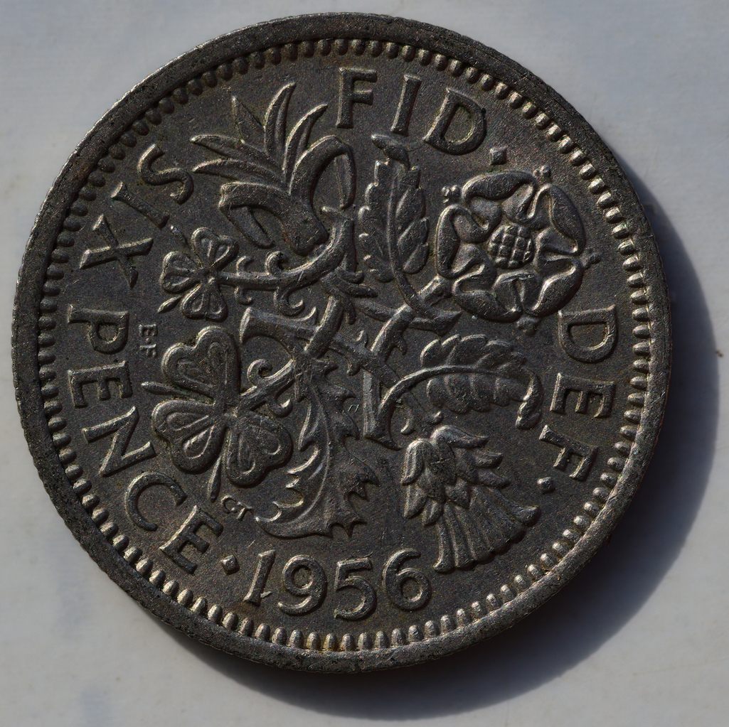 Sixpence coins have the national flower of Scotland on its back, a thistle. According to legend, in the 1200’s, the Danes from northern Europe attempted to invade Scotland. Hiding under the cover of darkness. A barefoot raider stepped on a thistle and howled out in pain, alerting the defenders who drove the Danes away. Also on the back of the coin are the words “Fid Def”, which is Latin for fidei desfensor, or defender of the faith.